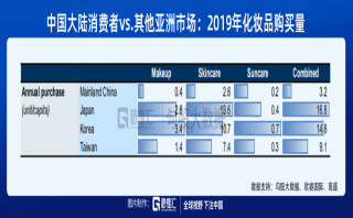 中國化妝品行業的空間和格局 中國化妝品行業未來的發展空間大,增長確定性強。 參考其他亞洲國家的情況可發現,化妝品消費水平和GDP之間存在較強的正相關關系。2019年中國化妝品支出/實際GDP為0.3%,而日韓的占比則為0.5~0.6%。 所謂市場發展潛力大,也就是天花板高,人均化妝品消費水平的上升空間大。歐睿國際數據顯示,2019年我國消費者人均購買3件化妝品。對比之下,日韓消費者人均購買15~1