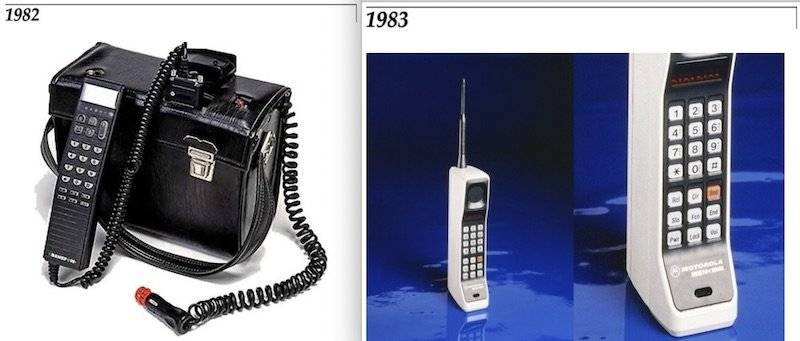 這臺(tái)機(jī)器是全球的第一臺(tái)真正的手機(jī),這也是全球第一次“真正的手機(jī)通話”——當(dāng)時(shí)歐美國家雖然有移動(dòng)電話,但全像臺(tái)式電腦一樣笨重(下圖左)。10 年后,這臺(tái)名叫 DynaTAC 的手機(jī)(下圖右)正式上市,這也是第一代的移動(dòng)通訊系統(tǒng)——1G 制式的正式登場。