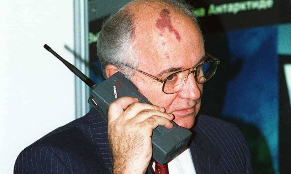 蘇聯(lián)領(lǐng)導(dǎo)人戈?duì)柊蛦谭蚴褂弥Z基亞 Cityman 900 通話。圖片來源:The Guardian