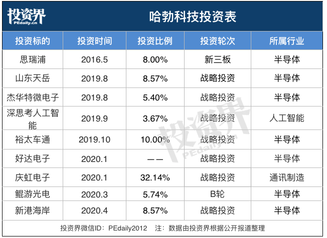 投資界根據(jù)公開的信息梳理,這一年來,哈勃投資相繼投資了9家企業(yè)。分別為:新港海岸(北京)科技有限公司、山東天岳先進材料科技有限公司、蘇州裕太車通電子科技有限公司、上海鯤游光電科技有限公司、深思考人工智能機器人科技(北京)有限公司、無錫市好達電子有限公司、杰華特微電子(杭州)有限公司、慶虹電子(蘇州)有限公司、思瑞浦微電子科技(蘇州)股份有限公司。
