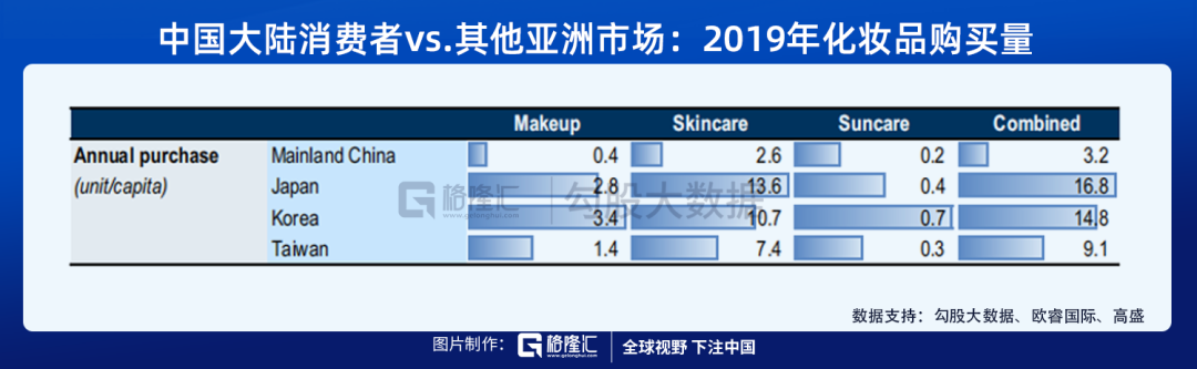 所謂市場發展潛力大,也就是天花板高,人均化妝品消費水平的上升空間大。歐睿國際數據顯示,2019年我國消費者人均購買3件化妝品。對比之下,日韓消費者人均購買15~17件化妝品。再從價格上來看,數據顯示,2017年中國化妝品人均消費額約為39美元,而同期,美國、日本、韓國的化妝品人均消費額卻分別高達240美元、292美元和220美元。