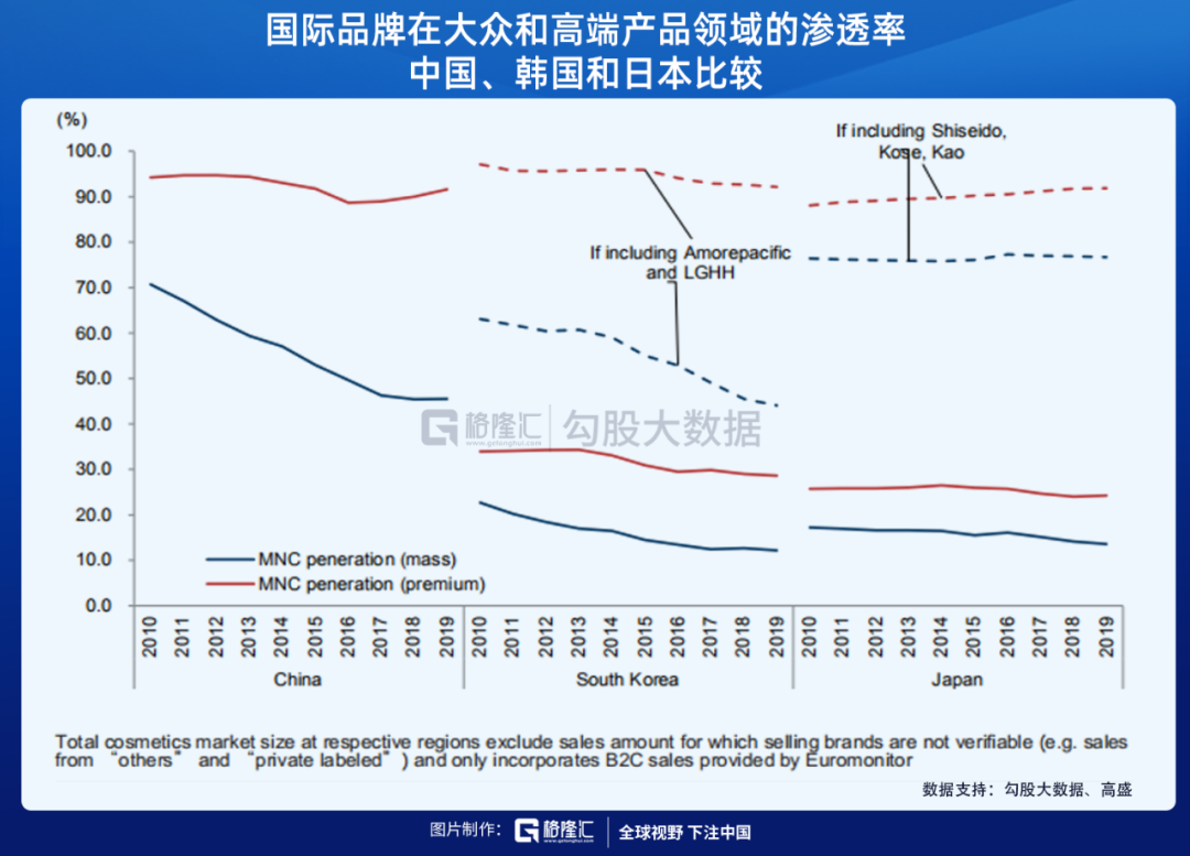 如果參考其他的亞洲國家,可以發現隨著市場的發展,國際品牌的市場份額最終會被成熟的本土品牌奪走,例如日本和韓國。所以,"四舍五入",我們或許可以直接下結論稱在中國的化妝品市場上,外資大牌終將會被本土大牌替代。