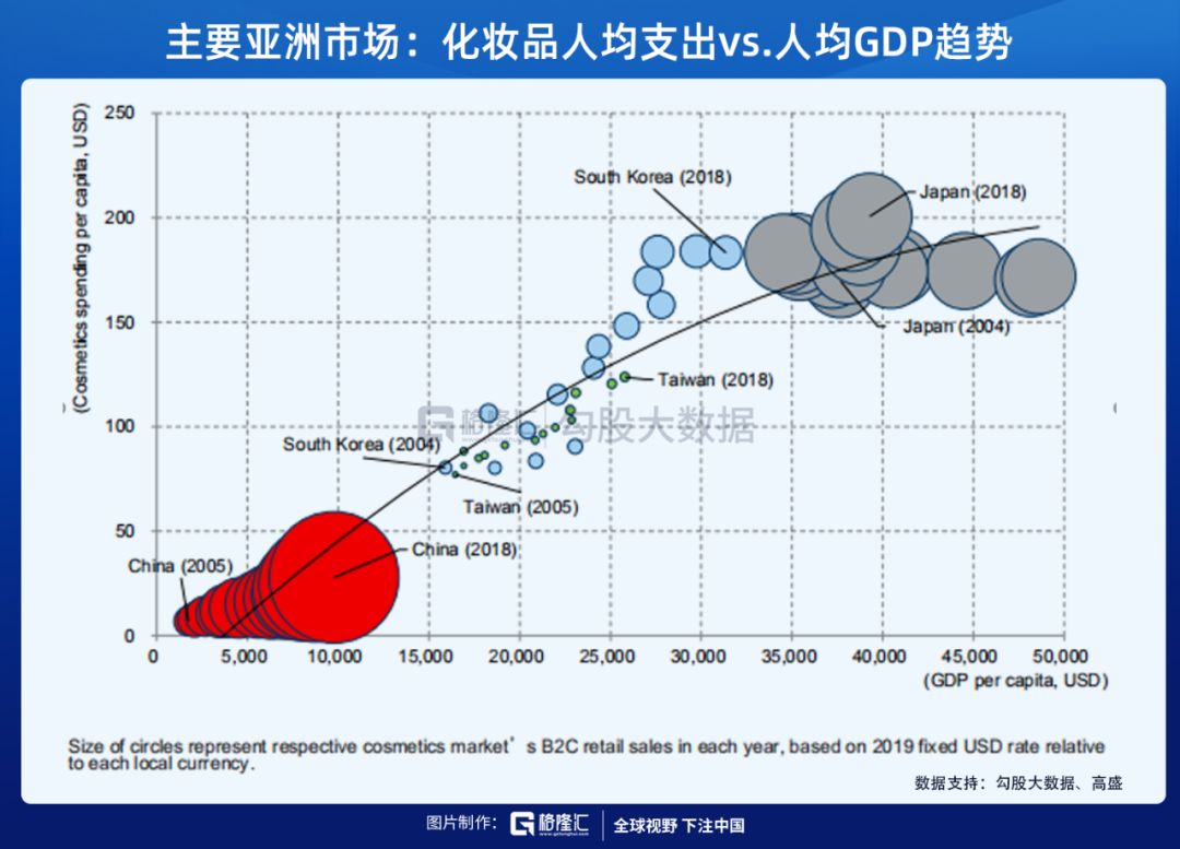 參考其他亞洲國家的情況可發現,化妝品消費水平和GDP之間存在較強的正相關關系。2019年中國化妝品支出/實際GDP為0.3%,而日韓的占比則為0.5~0.6%。